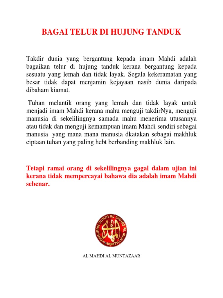 Telur Bagai telur di hujung tanduk Maksudnya. Bagai telur dihujung tanduk. Segala kekeramatan yang besar tidak dapat menjamin kejayaan nasib dunia daripada dibaham.